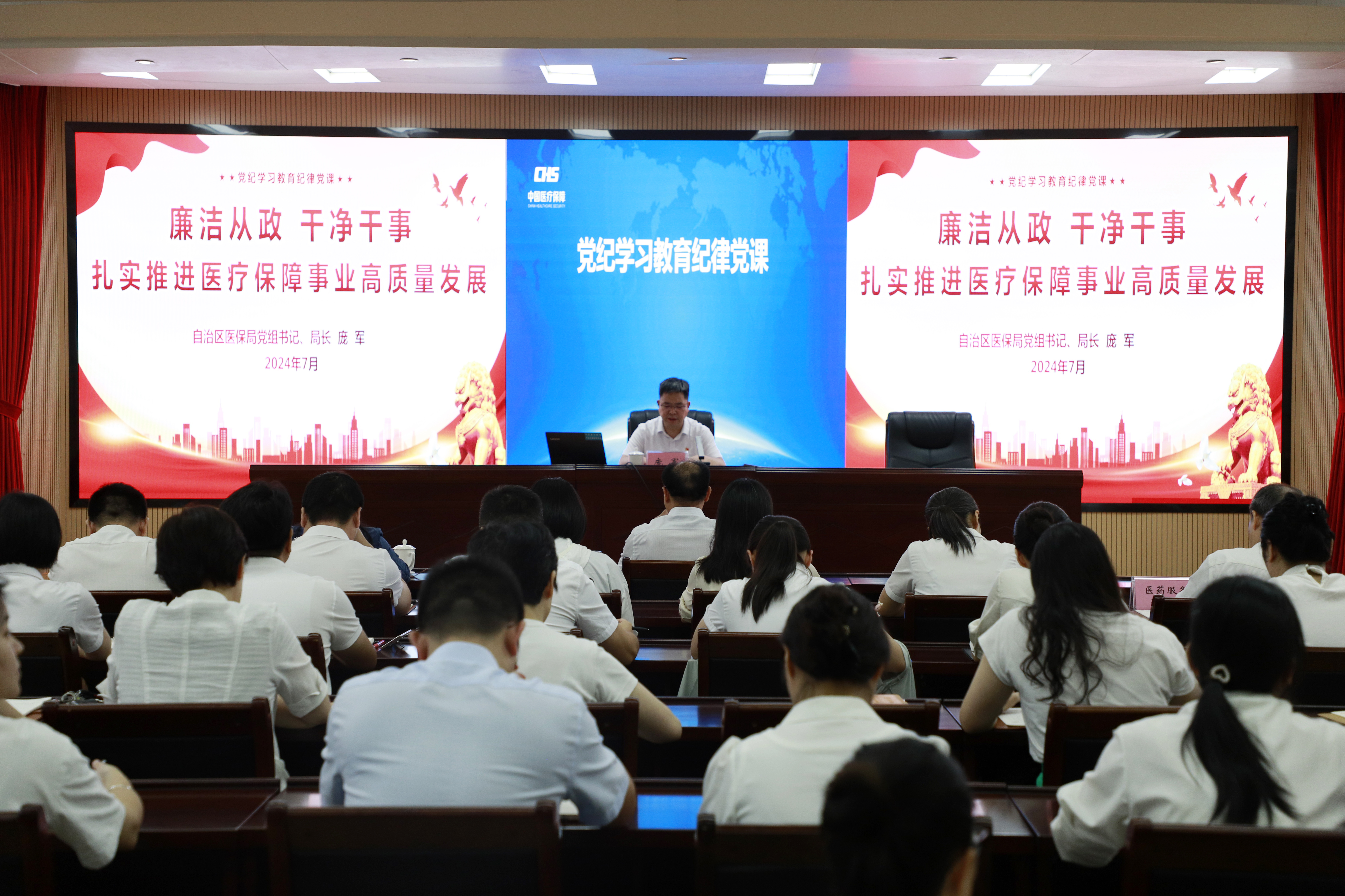 庞军以《廉洁从政 干净干事 扎实推进医疗保障事业高质量发展》为主题讲授党课,带领全体党员干部重温习近平总书记关于党的自我革命的重要思想、关于党的纪律建设重要论述和关于广西工作论述的重要要求,深入学习《中国共产党纪律处分条例》主要内容和主旨要义,教育引导党员干部要加强党性锻炼、严明政治纪律、强化宗旨观念,务必求真务实,提高拒腐防变能力,做学纪、知纪、明纪、守纪的表率。