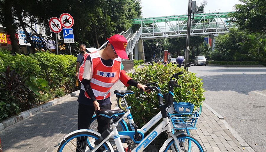 德州扑克在线 志愿服务队队员将重点区域内随意摆放的共享单车摆放整齐