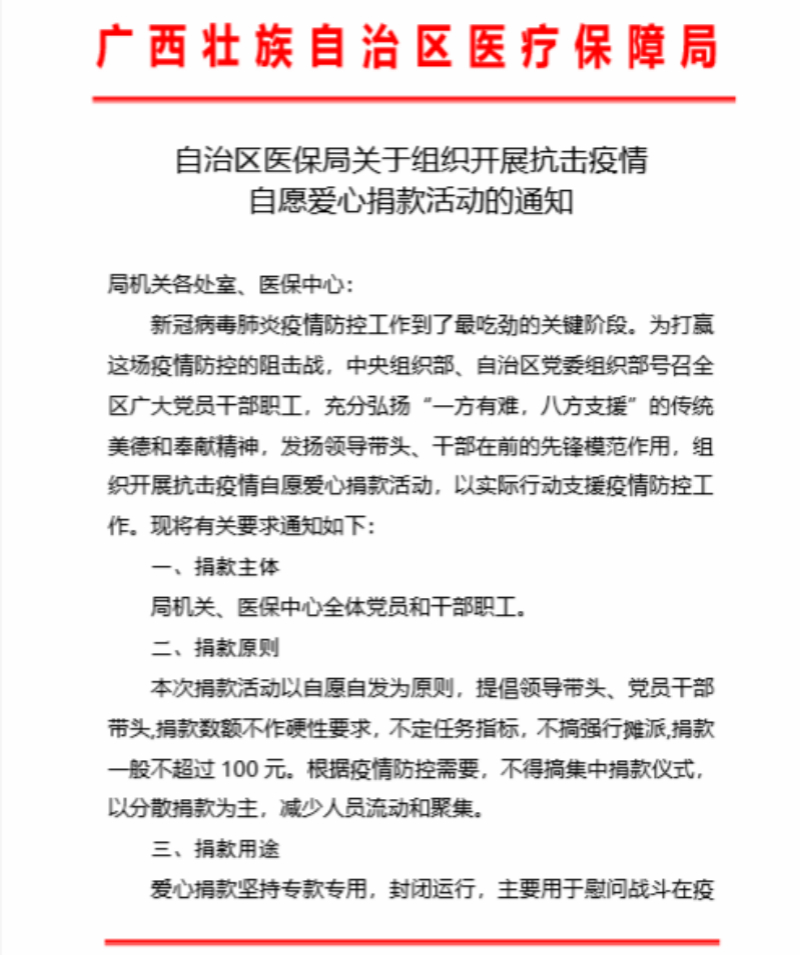 如今,新冠病毒肺炎疫情防控工作正是最吃劲的关键阶段,需要将每名党员的星火之力汇聚成战胜疫情的无穷力量,广西各级医保党员干部不忘初心、牢记使命,在做好各项医疗保障工作,落实防控措施的同时,纷纷捐款助战“疫”,传递暖心力量。